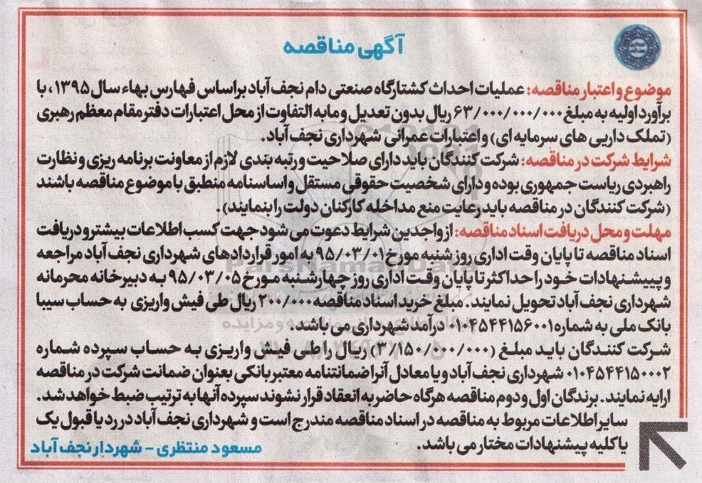 موضوع و اعتبار مناقصه: عملیات احداث کشتارگاه صنعتی دام نجف آباد بر اساس فهارس بهاء سال 1395 با برآورد اولیه به مبلغ 63.000.000.000 ریال بدون تعدیل و ما به التفاوت از محل اعتبارات دفتر مقام معظم رهبری تملک دارایی های سرمایه ای و اعتبارات عمرانی شهرداری نجف آباد