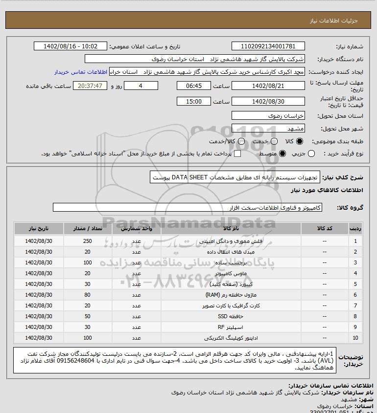 شرح کلی نیاز: تجهیزات سیستم رایانه ای مطابق مشخصات DATA SHEET پیوست