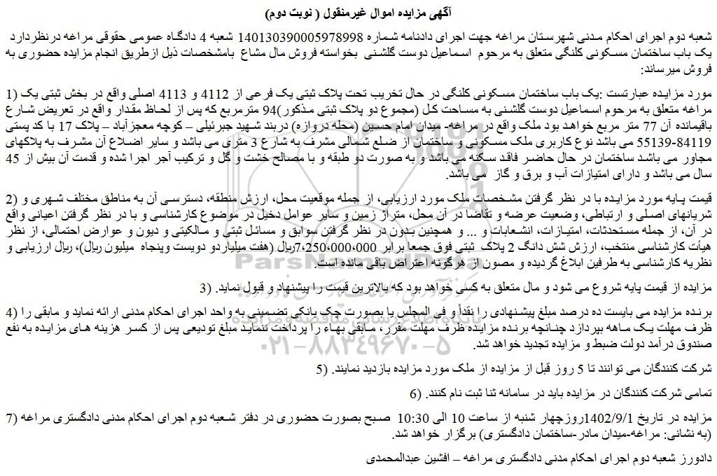 شعبه دوم اجرای احکام مدنی شهرستان مراغه جهت اجرای دادنامه شماره 140130390005978998 شعبه 4 دادگاه عمومی حقوقی مراغه درنظردارد یک باب ساختمان مسکونی کلنگی متعلق به مرحوم اسماعیل دوست گلشنی بخواسته فروش مال مشاع بامشخصات ذیل ازطریق انجام مزایده حضوری به فروش میرساند: