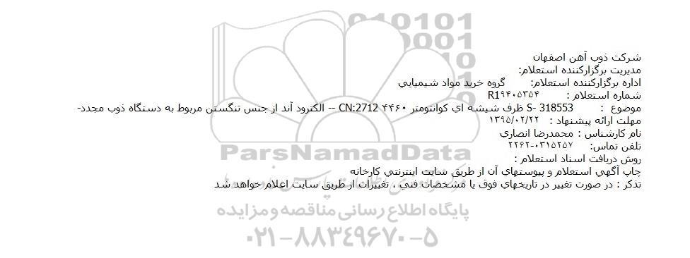 استعلام بها و موضوع استعلام استعلام ظرف شیشه ای کوانتومتر - الکترود آند از جنس تنگستن مربوط به دستگاه ذوب به اطلاع کلیه شرکتها و افراد متخصص واجد شرایط میرساند، آگهی گذار در نظر دارد از طریق استعلام بها، نسبت به انتخاب و دریافت پیشنهادات اقدام نماید. این استعلام با کد آگهی ثبت شده در سامانه خبرگزاری پارس نماد : 660226 منتشر شده است. مشخصات استعلام : تاریخ شروع استعلام: 1395/02/19 آخرین مهلت ارسال پیشنهاد قیمت : 1395/02/22 و محل اجرای پروژه : استان اصفهان میباشد. استعلام قیمت مورد درخواست : استعلام ظرف شیشه ای کوانتومتر - الکترود آند از جنس تنگستن مربوط به دستگاه ذوب با دستهبندیهای تخصصی و گروه های مرتبط : الکترود, خدمات و تجهیزات آزمایشگاهی و پزشکی, صنایع شیشه, استعلام اطلاع رسانی میگردد.