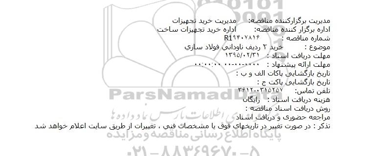 اداره برگزار کننده مناقصه: اداره خرید تجهیزات ساخت