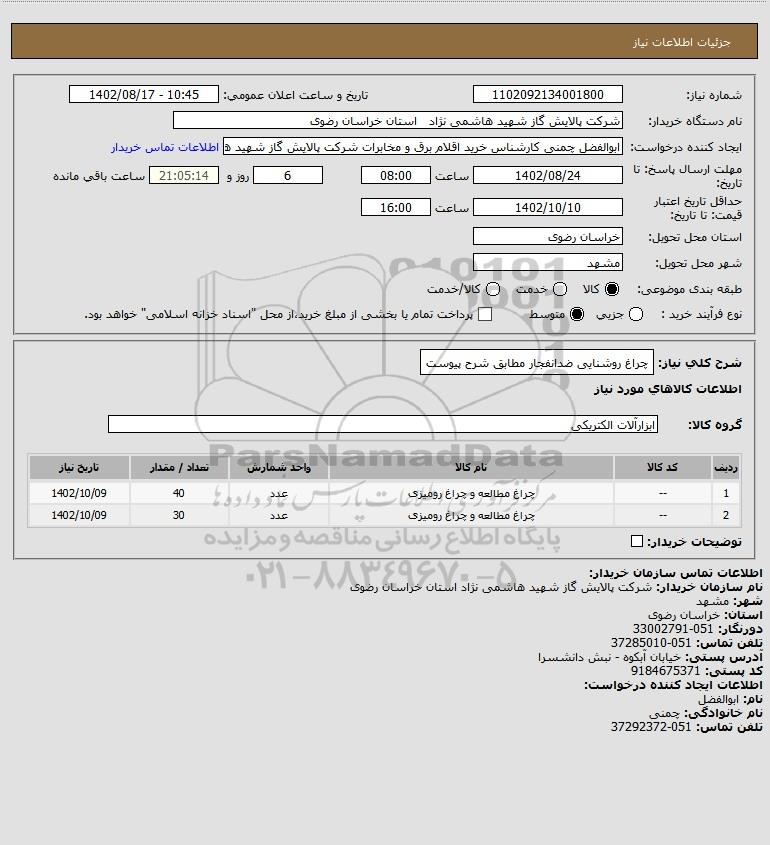 شرح کلی نیاز: چراغ روشنایی ضدانفجار مطابق شرح پیوست