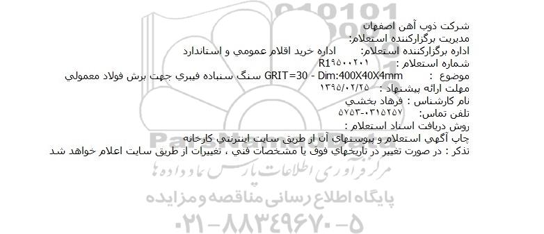 موضوع : GRIT=30 - Dim:400X40X4mm سنگ سنباده فیبری جهت برش فولاد معمولی