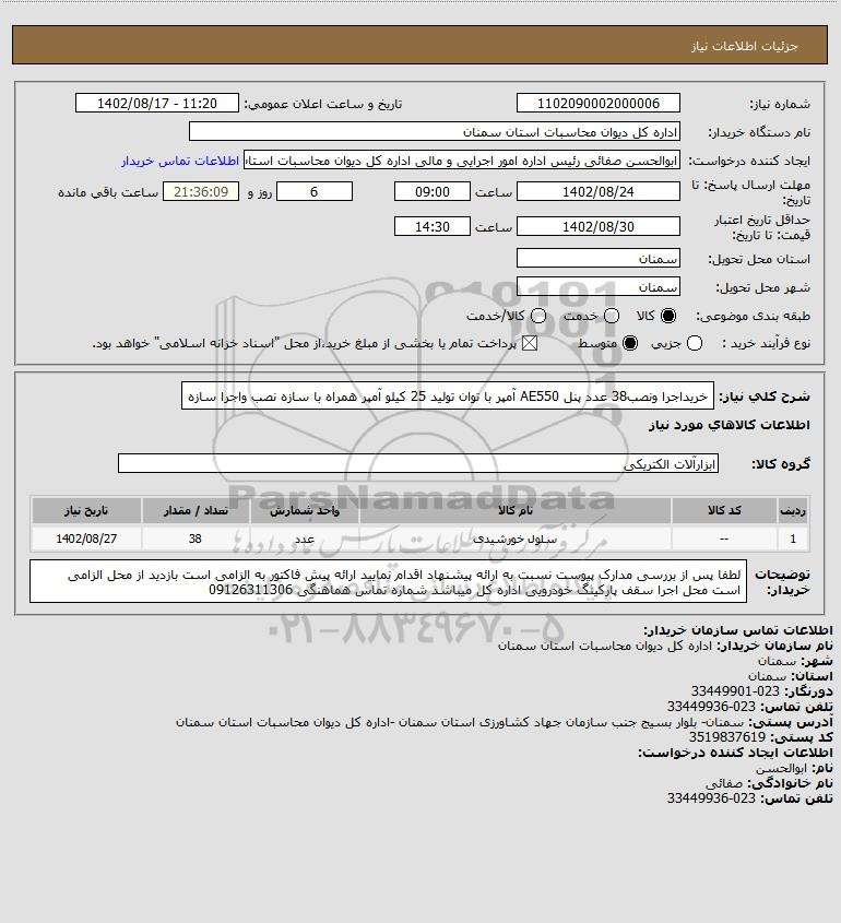 استعلام خریداجرا ونصب38 عدد پنل AE550 آمپر با توان تولید 25 کیلو آمپر همراه با سازه نصب واجرا سازه, استعلام خریداجرا ونصب38 عدد پنل AE550 آمپر با توان تولید 25 کیلو آمپر همراه با سازه نصب واجرا سازه
