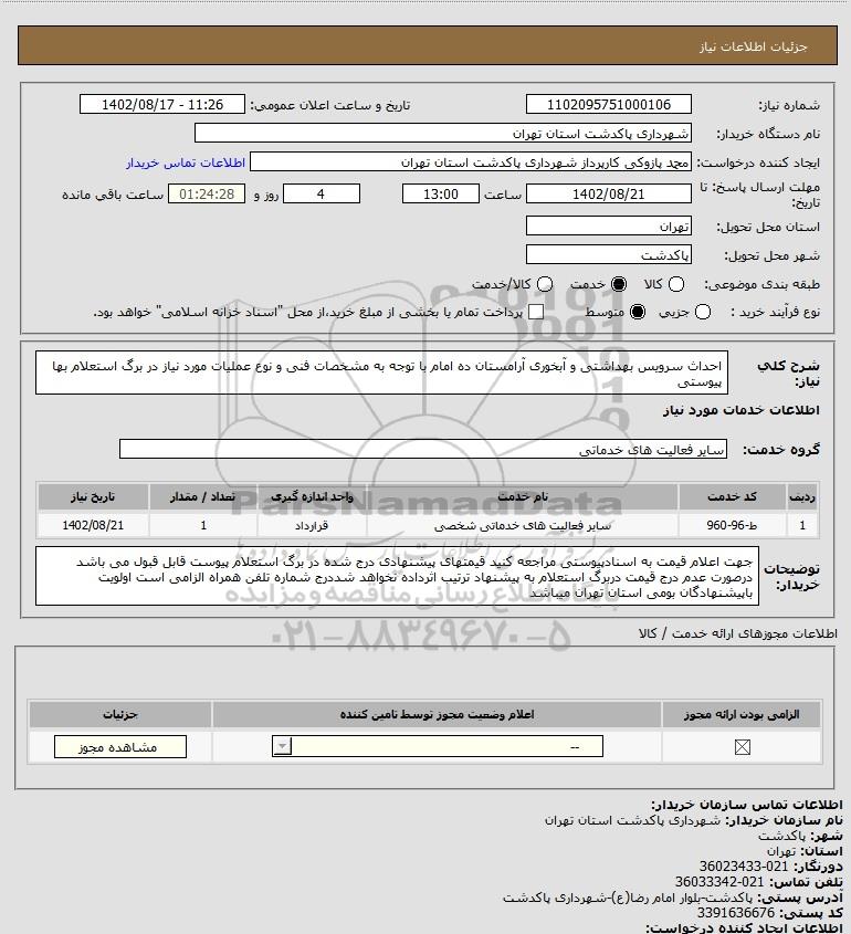 شرح کلی نیاز: احداث سرویس بهداشتی و آبخوری آرامستان ده امام با توجه به مشخصات فنی و نوع عملیات مورد نیاز در برگ استعلام بها پیوستی