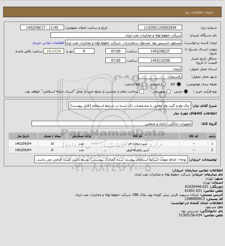 شرح کلی نیاز: چک ولو و گیت ولو مطابق با مشخصات ذکر شده در شرایط استعلام (فایل پیوست)