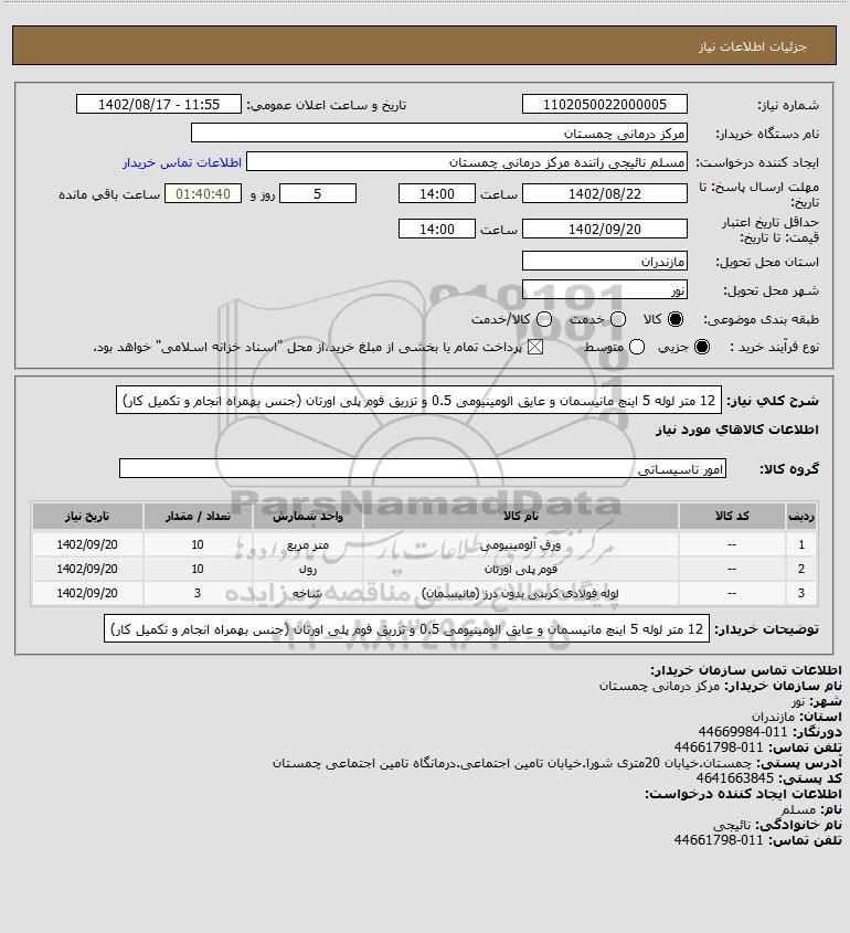 شرح کلی نیاز: 12 متر لوله 5 اینچ مانیسمان و عایق الومینیومی 0.5 و تزریق فوم پلی اورتان (جنس بهمراه انجام و تکمیل کار)