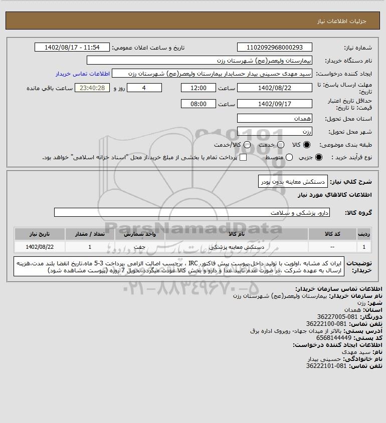نام دستگاه خریدار:بیمارستان ولیعصر(عج) شهرستان رزن