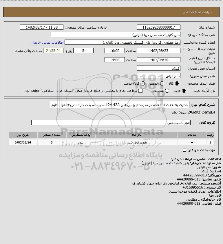 شرح کلی نیاز: باطری به جهت استفاده در سیستم یو پی اس 12V 42A سرب اسیدی دارای دریچه خود تنظیم