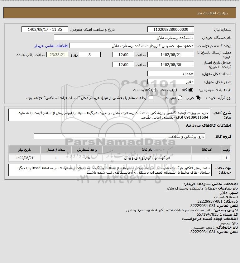 | 1 | -- | لارنگوسکوپ گوش و حلق و بینی | عدد | 1 | 1402/08/21 |