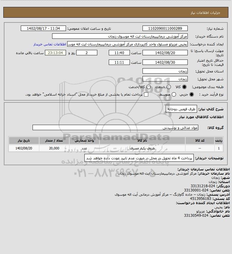 | 1 | -- | ظروف یکبار مصرف | عدد | 20,000 | 1402/08/20 |
