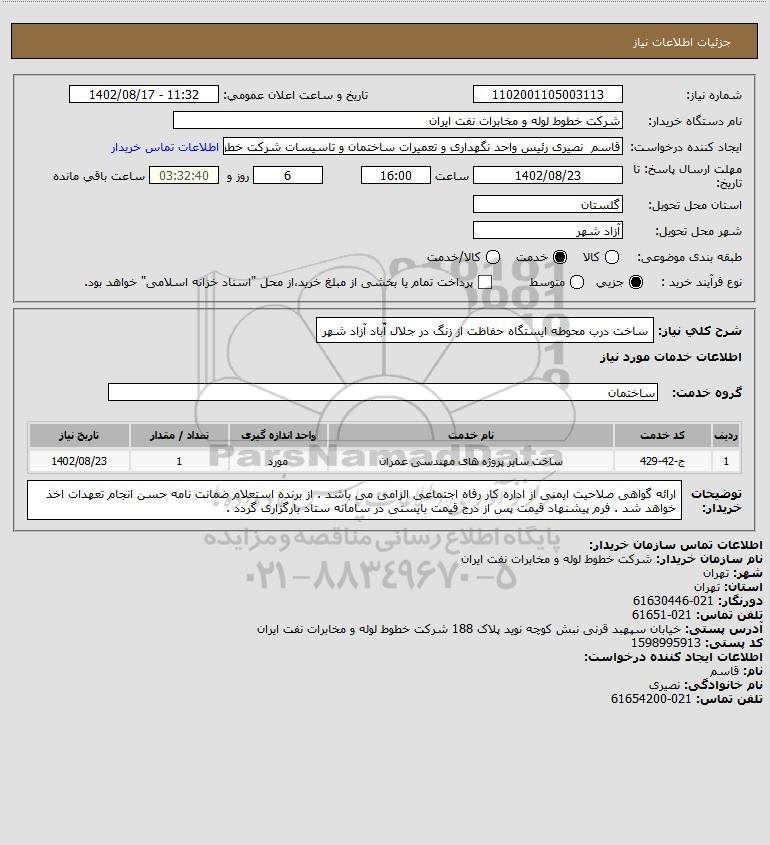 شرح کلی نیاز: ساخت درب محوطه ایستگاه حفاظت از زنگ در جلال آّباد آزاد شهر