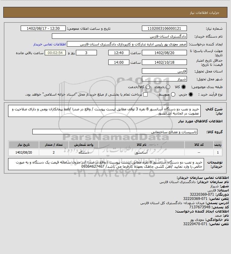 شرح کلی نیاز: خرید و نصب دو دستگاه آسانسور 8 نفره 3 توقف مطابق لیست پیوست / واقع در صدرا /فقط پیمانکاران بومی و دارای صلاحیت و عضویت در اتحادیه آسانسور