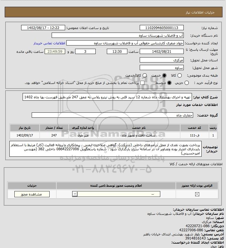 شرح کلی نیاز: تهیه و اجرای بهسازی چاه شماره 12 سید قلی به روش نیترو پلاس به عمق 247 متر،طبق فهرست بها چاه 1402