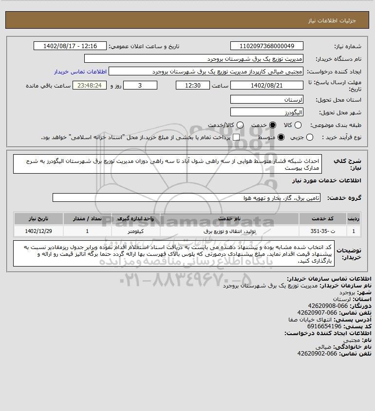 شرح کلی نیاز: احداث شبکه فشار متوسط هوایی از سه راهی شول آباد تا سه راهی دوزان مدیریت توزیع برق شهرستان الیگودرز به شرح مدارک پیوست