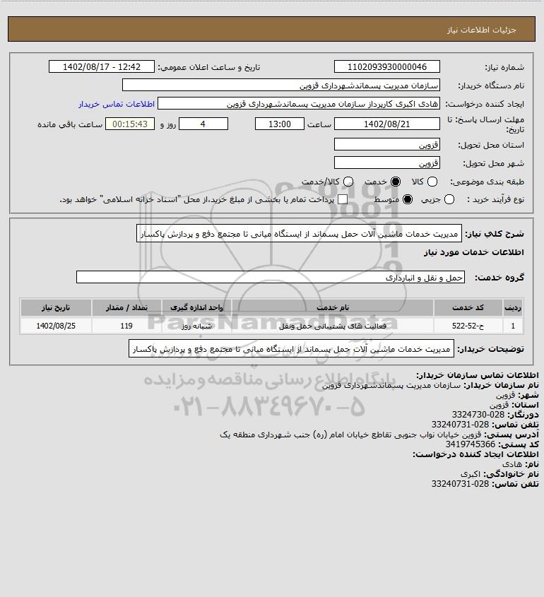 نام دستگاه خریدار:سازمان مدیریت پسماندشهرداری قزوین