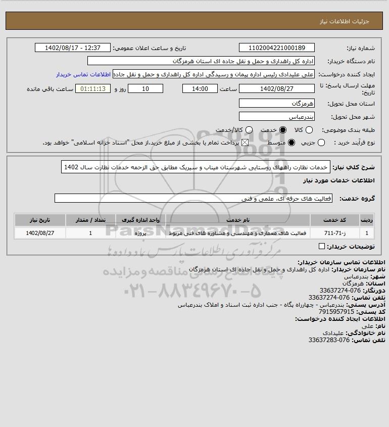 شرح کلی نیاز: خدمات نظارت راههای روستایی شهرستان میناب و سیریک مطابق حق الزحمه خدمات نظارت سال 1402