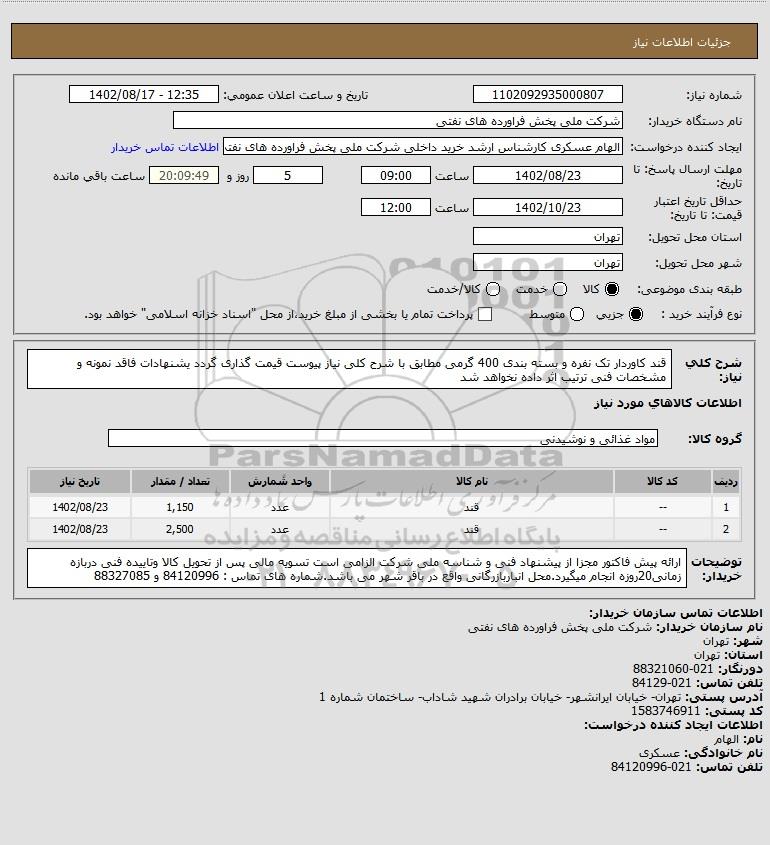 شرح کلی نیاز: قند کاوردار تک نفره و بسته بندی 400 گرمی