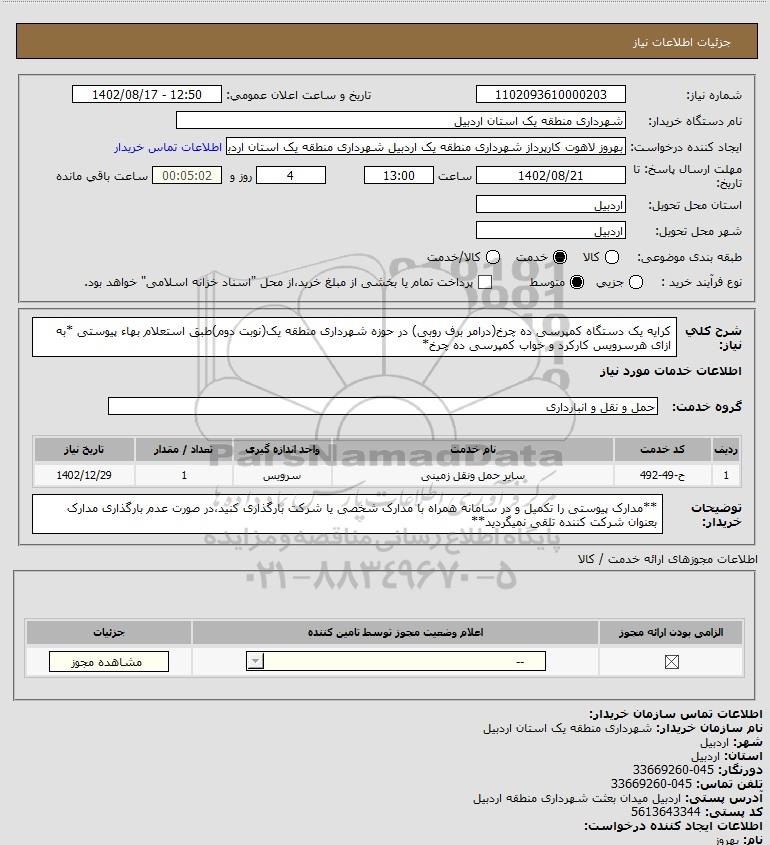 شرح کلی نیاز: کرایه یک دستگاه کمپرسی ده چرخ(درامر برف روبی) در حوزه شهرداری منطقه یک(نوبت دوم)طبق استعلام بهاء پیوستی *به ازای هرسرویس کارکرد و خواب کمپرسی ده چرخ*