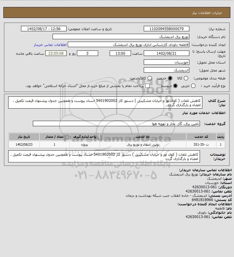 نام دستگاه خریدار:توزیع برق اندیمشک