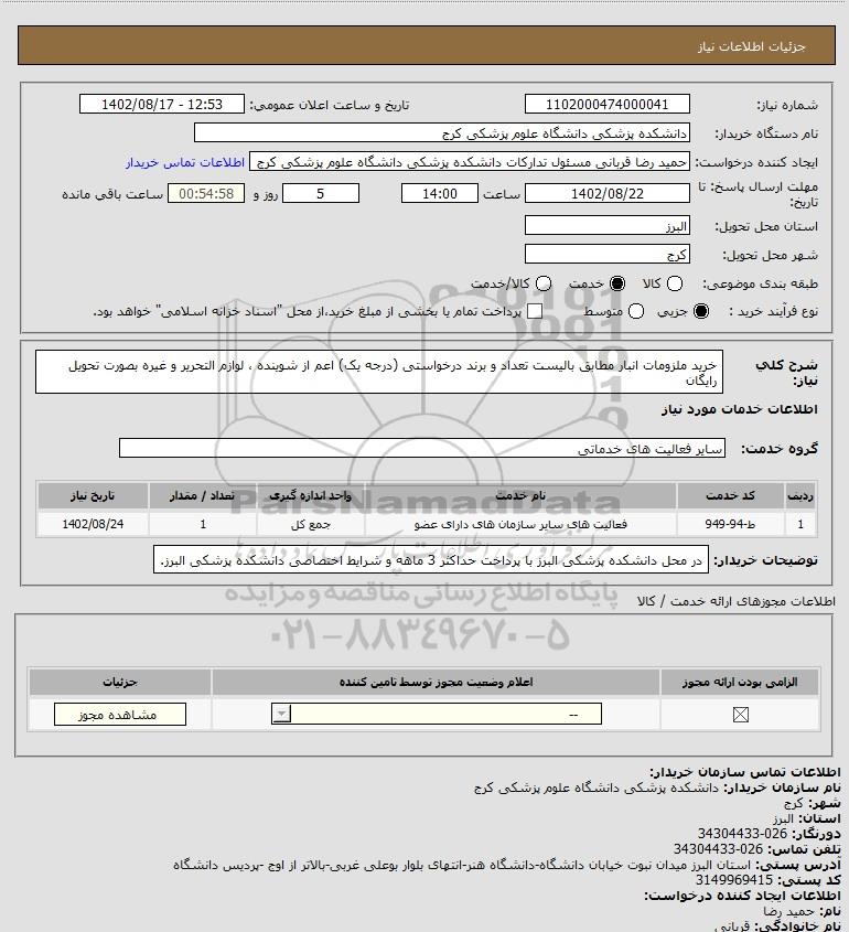 نام دستگاه خریدار:دانشکده پزشکی دانشگاه علوم پزشکی کرج