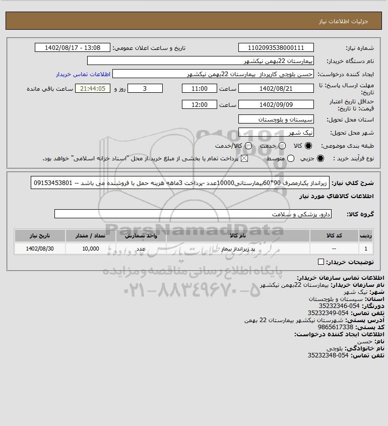 شرح کلی نیاز: زیرانداز یکبارمصرف 90*60بیمارستانی10000عدد -پرداخت 3ماهه هزینه حمل با فروشنده می باشد -- 09153453801