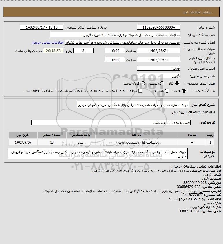 شرح کلی نیاز: تهیه، حمل، نصب و اجرای تأسیسات برقی بازار همگانی خرید و فروش خودرو