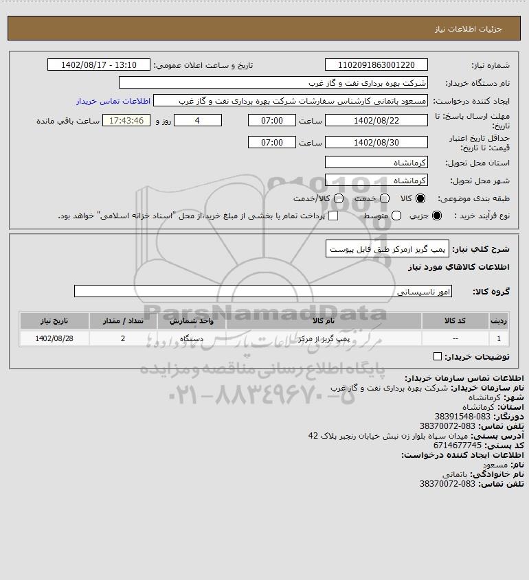 شرح کلی نیاز: پمپ گریز ازمرکز طبق فایل پیوست