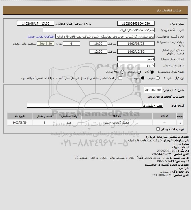 | 1 | -- | عملگر (اکچویتور) شیر | عدد | 5 | 1402/08/29 |