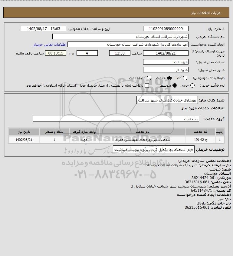 شرح کلی نیاز: بهسازی خیابان 12 متری شهر شرافت