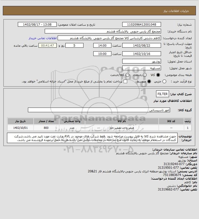 مناقصات فیلتر گاز