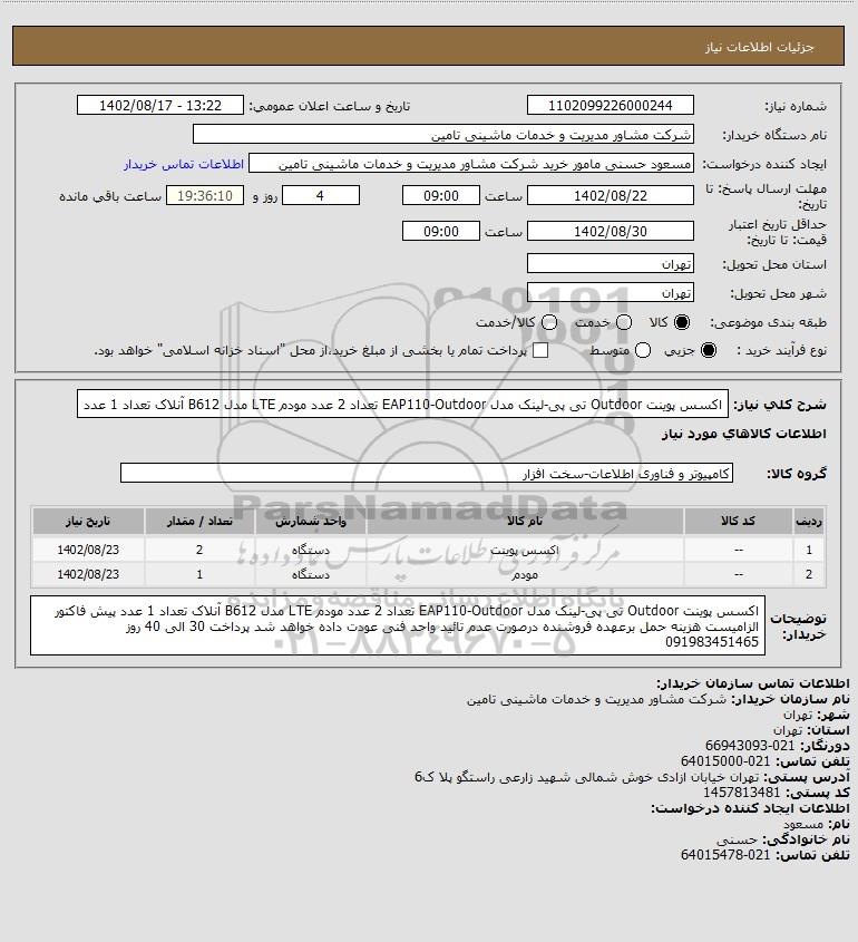شرح کلی نیاز: اکسس پوینت Outdoor تی پی-لینک مدل EAP110-Outdoor تعداد 2 عدد مودم LTE مدل B612 آنلاک تعداد 1 عدد