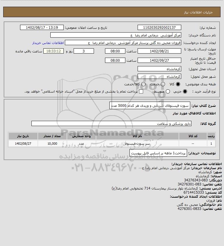 شرح کلی نیاز: سوزن فیستولای شریانی و وریدی هر کدام 5000 عدد