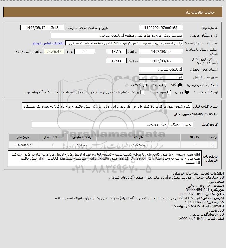 شرح کلی نیاز: پکیج شوفاژ دیواری گازی 36 کیلو وات فن دار برند ایران رادیاتور با ارائه پیش فاکتور و درج نام کالا به تعداد یک دستگاه