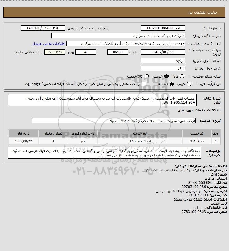 شرح کلی نیاز: عملیات تهیه واجرای بخشی از شبکه توزیع وانشعابات آب شرب روستای مراد آباد شهرستان اراک مبلغ برآورد اولیه : 1.906.154.904 ریال