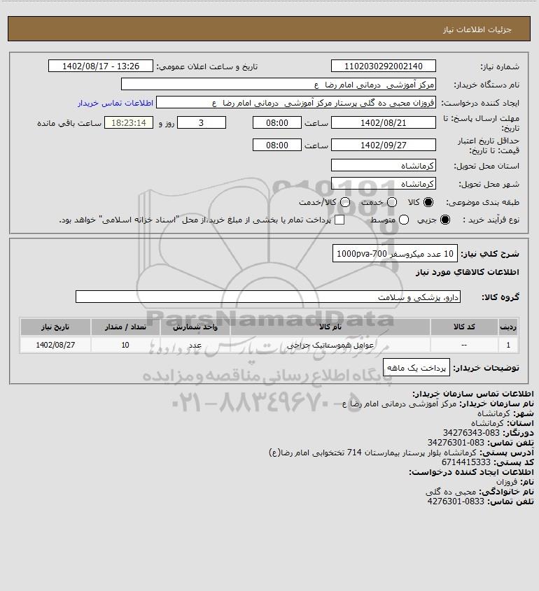 استعلام بها و موضوع استعلام استعلام 10 عدد میکروسفر 700-1000pva به اطلاع کلیه شرکتها و افراد متخصص واجد شرایط میرساند، آگهی گذار در نظر دارد از طریق استعلام بها، نسبت به انتخاب و دریافت پیشنهادات اقدام نماید. این استعلام با کد آگهی ثبت شده در سامانه خبرگزاری پارس نماد : 6603535 منتشر شده است. مشخصات استعلام : تاریخ شروع استعلام: 1402/08/17 آخرین مهلت ارسال پیشنهاد قیمت : 1402/08/21 و محل اجرای پروژه : استان کرمانشاه میباشد. استعلام قیمت مورد درخواست : استعلام 10 عدد میکروسفر 700-1000pva با دستهبندیهای تخصصی و گروه های مرتبط : خدمات و تجهیزات آزمایشگاهی و پزشکی, استعلام اطلاع رسانی میگردد.