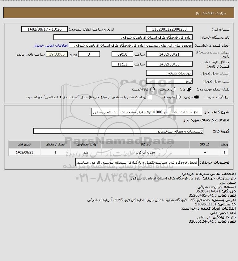 شرح کلی نیاز: منبع ایستاده مشعل دار 1000لیتری طبق مشخصات استعلام پیوستی