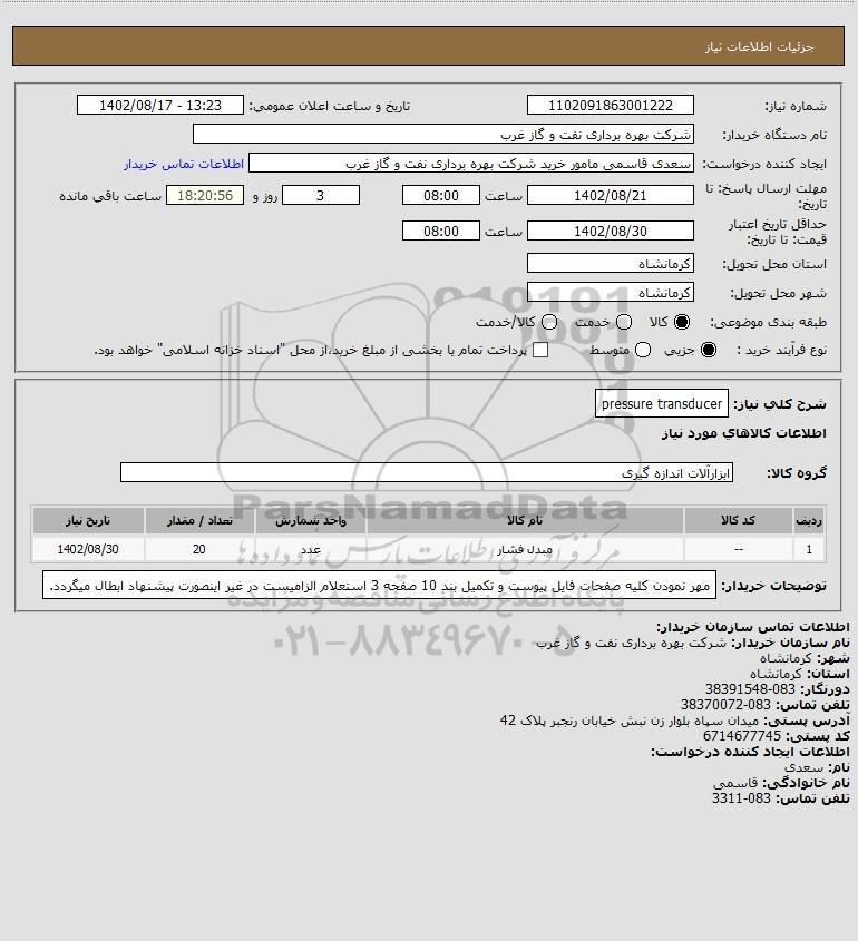 | 1 | -- | مبدل فشار | عدد | 20 | 1402/08/30 |
