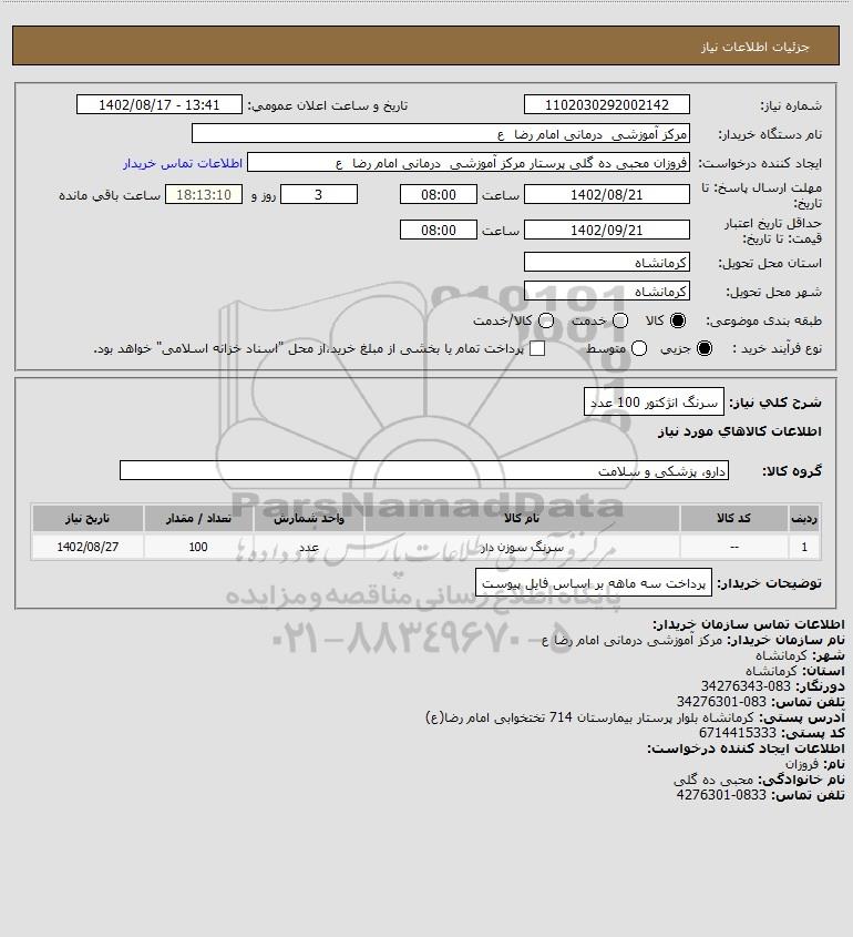 | 1 | -- | سرنگ سوزن دار | عدد | 100 | 1402/08/27 |