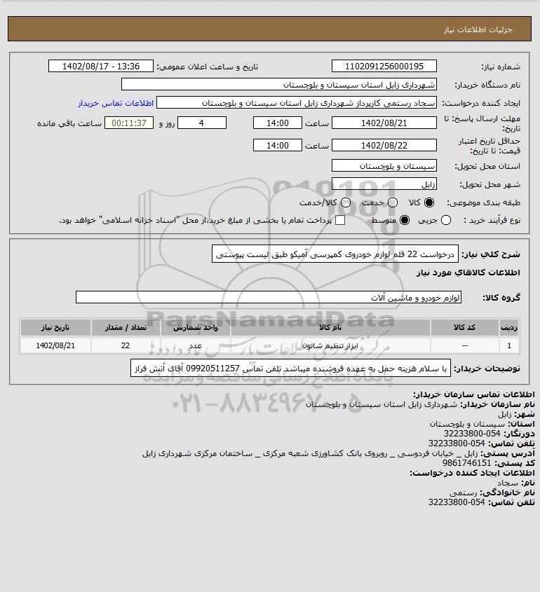 شرح کلی نیاز: درخواست 22 قلم لوازم خودروی کمپرسی آمیکو طبق لیست پیوستی