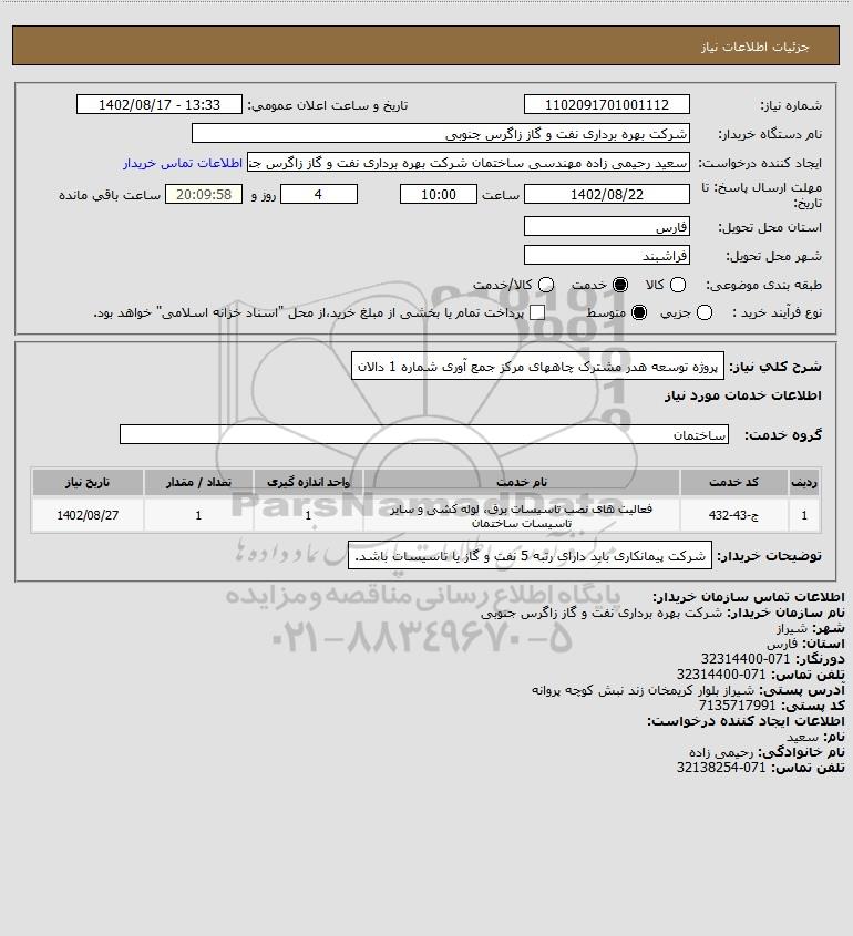 شرح کلی نیاز: پروژه توسعه هدر مشترک چاههای مرکز جمع آوری شماره 1 دالان