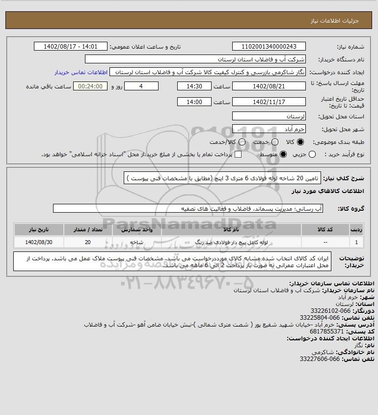 شرح کلی نیاز: تامین 20 شاخه لوله فولادی 6 متری 3 اینچ (مطابق با مشخصات فنی پیوست )