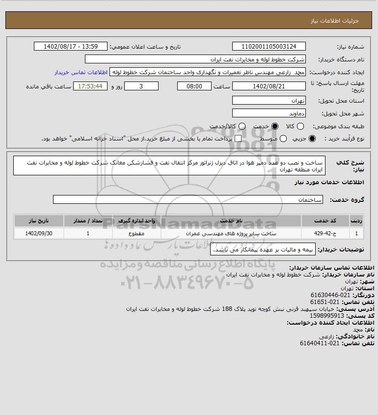شرح کلی نیاز: ساخت و نصب دو عدد دمپر هوا در اتاق دیزل ژنراتور مرکز انتقال نفت و فشارشکن مغانک شرکت خطوط لوله و مخابرات نفت ایران منطقه تهران