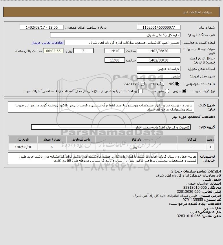 استعلام مادربرد و پرینت سرور طبق مشخصات پیوستی 6 عدد لطفا برگه پیشنهاد قیمت یا پیش فاکتور پیوست گردد در غیر این صورت مبلغ پیشنهادی رد خواهد شطد, استعلام مادربرد و پرینت سرور طبق مشخصات پیوستی 6 عدد لطفا برگه پیشنهاد قیمت یا پیش فاکتور پیوست گردد در غیر این صورت مبلغ پیشنهادی رد خواهد شطد
