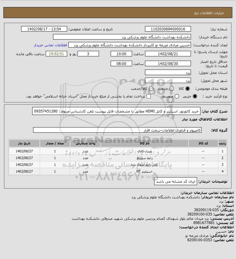 نام دستگاه خریدار:دانشکده بهداشت دانشگاه علوم پزشکی یزد
