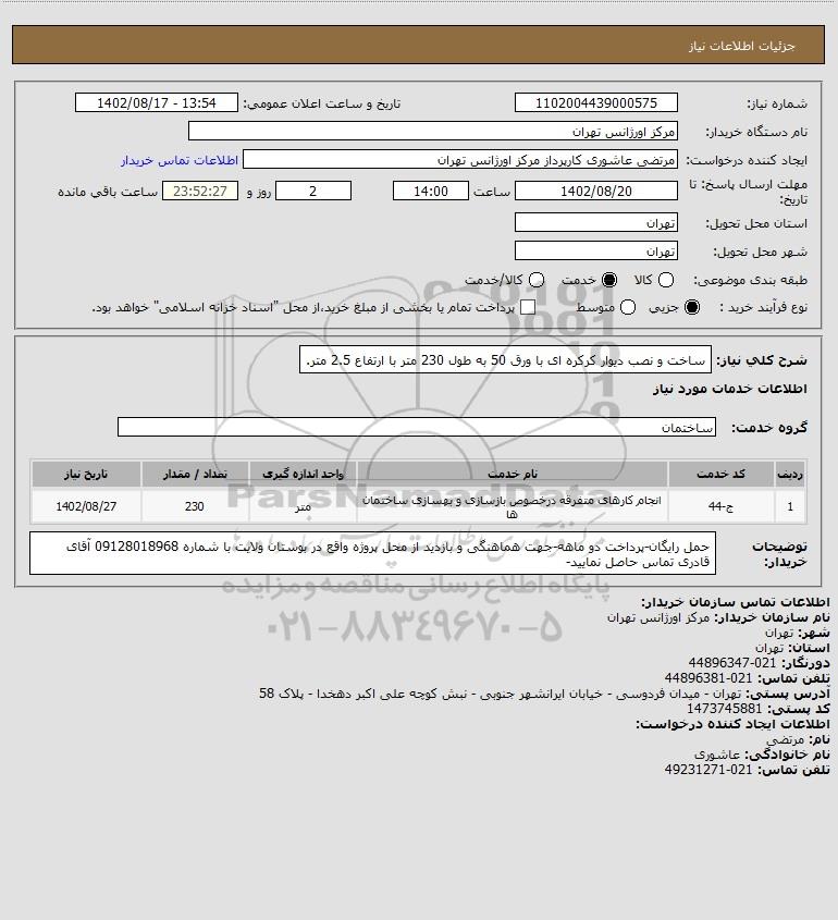شرح کلی نیاز: ساخت و نصب دیوار کرکره ای با ورق 50 به طول 230 متر با ارتفاع 2.5 متر.