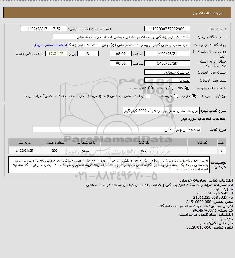 شرح کلی نیاز: برنج باسماتی سبز بهار درجه یک 2000 کیلو گرم