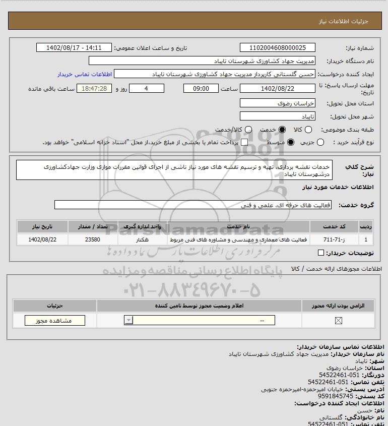 شرح کلی نیاز: خدمات نقشه برداری، تهیه و ترسیم نقشه های مورد نیاز ناشی از اجرای قوانین مقررات موازی وزارت جهادکشاورزی درشهرستان تایباد