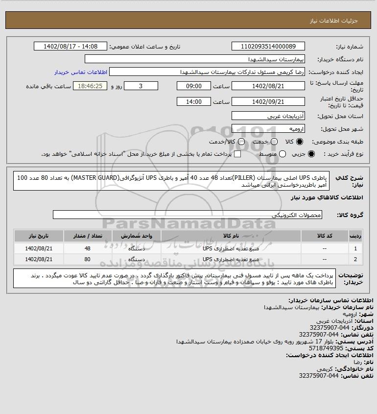 شرح کلی نیاز: باطری UPS اصلی بیمارستان (PILLER)تعداد 48 عدد 40 آمپر و باطری UPS آنژیوگرافی(MASTER GUARD) به تعداد 80 عدد 100 آمپر باطریدرخواستی ایرانی میباشد
