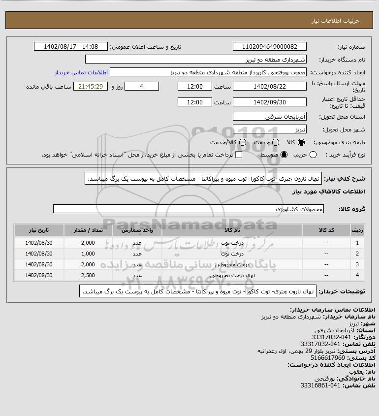 شرح کلی نیاز: نهال نارون چتری- توت کاکوزا- توت میوه و پیراکانتا - مشخصات کامل به پیوست یک برگ میباشد.